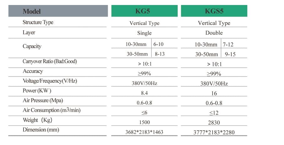 Máy tách quang đá thạch anh ướt KGS5 có các thông số kỹ thuật tiên tiến, hỗ trợ tối ưu trong việc phân loại quặng. Một trong những ưu điểm nổi bật của KGS5 là khả năng xử lý các loại quặng có kích thước từ 10 mm đến 30 mm, đảm bảo linh hoạt trong quy trình sản xuất. Hệ thống phân loại hai tầng kết hợp với công nghệ quét quang học tiên tiến giúp nhận diện chi tiết màu sắc, hình dạng và chất liệu của từng viên quặng, từ đó tối ưu hóa quy trình phân loại.